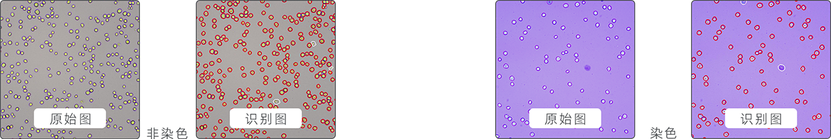非染色計數(發明專利號:ZL 201310101403.0):無需染色,直接對細胞進行計數和區分活死細胞,適用于狀態良好、背景干凈的培養細胞;臺盼藍染色計數:區分活細胞和死細胞的經典方法,相比非染色法,色彩變化更直觀。